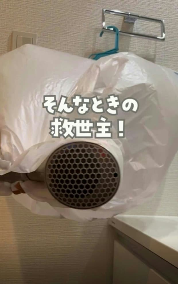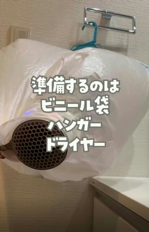 タオル掛け等にハンガーを掛け、ビニール袋にドライヤーを入れて温風を当てます。