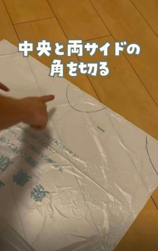 まず、画像を参考にしながら、ビニール袋の中央と両端の角の部分をハサミでカットします。初めてのときは、画像のように油性ペンで下書きをしたうえで切ると失敗の心配は要りません。