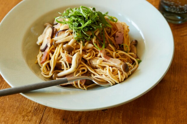 ③フライパンにオリーブオイル、にんにくを入れて中火で熱し、きのこを加えてしんなりとするまで炒める。ベーコンを加えてさっと炒め、❶、Aを加えてなじむまで炒め合わせる。器に盛り、青じそをのせる。