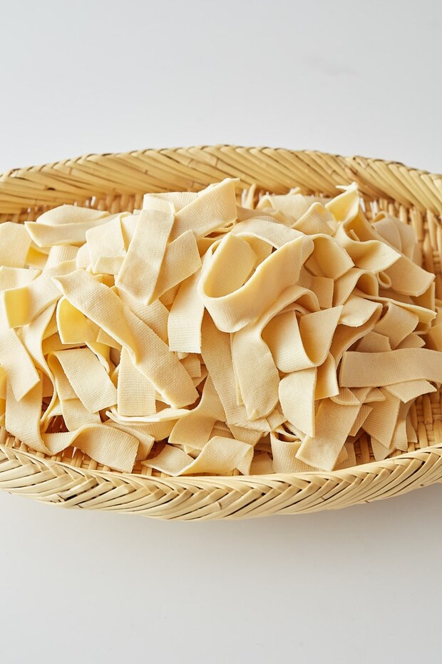 平たい帯状の豆腐干。汁気の多い煮ものや鍋に活用したり、平麺の代わりに使ったりするのがオススメ。