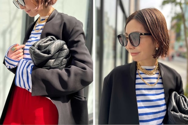 「アパルトモンで定番になっている裾リブパンツに合わせて、今季新しく作られたジャケットを単品で着用。セットアップで着るのも素敵ですが、今はボーダーやビビットな赤を差したMIXスタイルでコーディネートしたい気分。ボリュームのあるゴールドジュエリーやサンダルできれいめな印象にしてみました」
