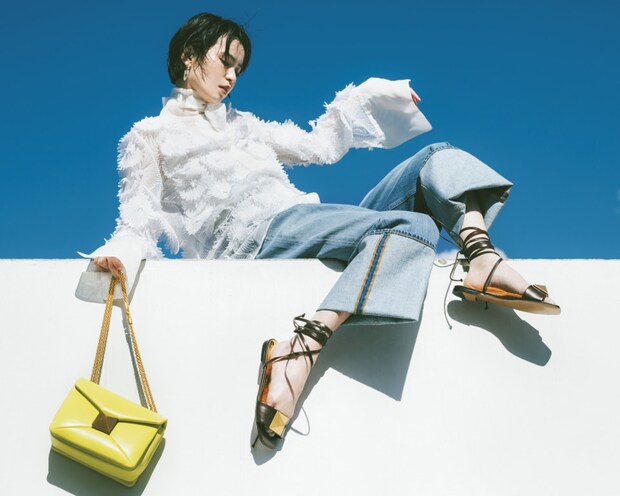 安西さん、これ「ワンスタッズ」と呼ばれています。シンプルでモダンなスタッズ使いの新作が豊富な今季、注目です。バッグ[H14×W19×D11㎝]¥403,700、サンダル[ヒール0.5㎝]¥126,500、ピアス¥75,900(全てヴァレンティノ ガラヴァーニ)、シャツ¥1,045,000、デニム¥143,000(共にヴァレンティノ/全てヴァレンティノ インフォメーションデスク)