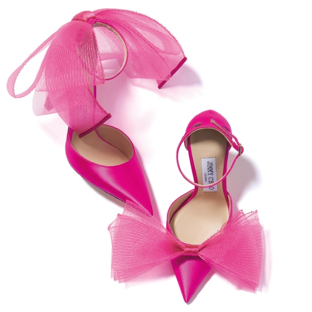 フューシャピンクのグログランテープは手作業で付けられているそう。贅沢! パンプス「エイヴェリー」[ヒール10㎝]¥135,300(共にジミー チュウ)
