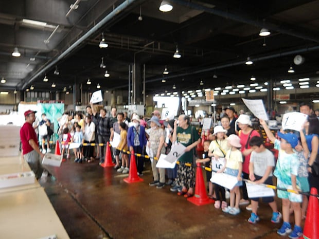 午前9時から先着60名限定で参加できるこのコーナーでは、実際に市場で行われているせりの雰囲気を体験できます。