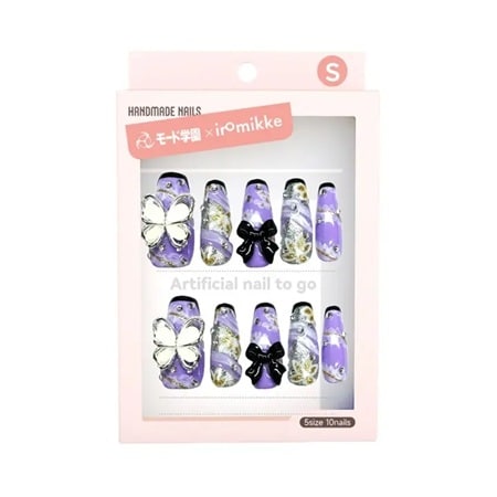 「夢見月」は、幻想的な紫を纏い、和×ゴスロリ風の世界観を指先に閉じ込めたデザイン。着物柄を思わせる花や模様に、蝶やリボンを重ねて華やかさをプラスした。