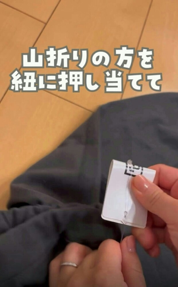 タグをひもに押し当てたまま、強く引っ張ります。ゆみ|ワンオペ×ストレスフリーな育児さんによると、強めの力が必要なようなので、思いっきり引っ張りましょう。