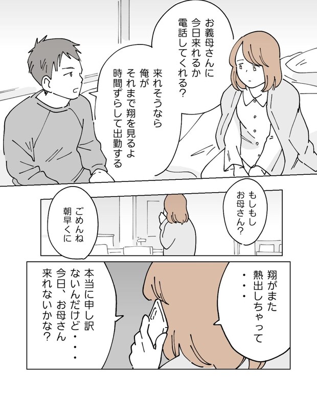 そして翌朝。昨日よりはマシになりましたが、翔の熱は案の定下がらず、私たちは途方に暮れます。「ねぇ、今日の打ち合わせ抜けられなくて・・・やっぱり休めない?」そう良平に頼むも、彼は困ったような表情を浮かべて黙り込んでしまいました。