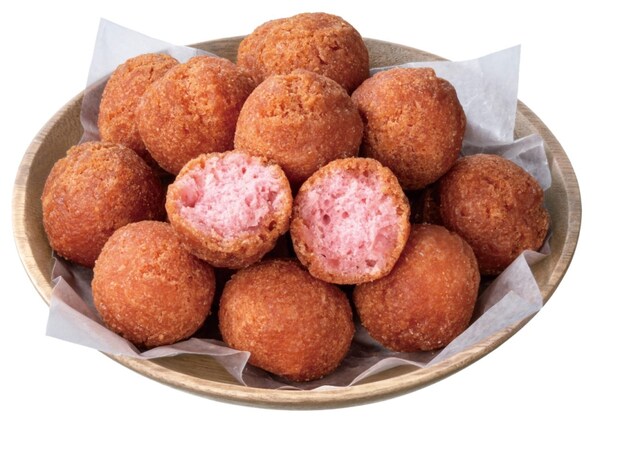 軽い食感で、ほんのり甘いいちご風味のボールドーナツが16個入っている。