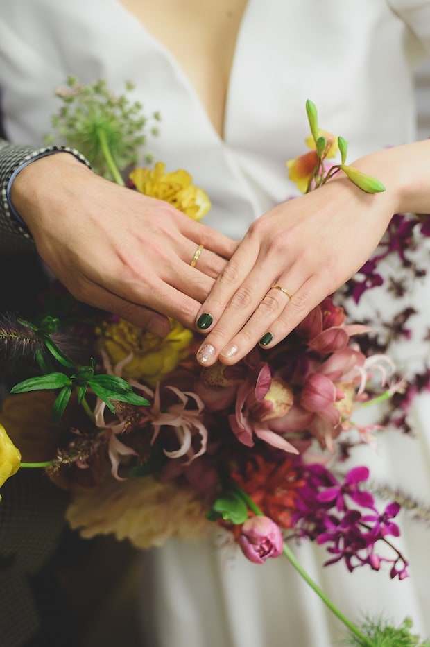 鮮やかなブーケにもマッチするダークグリーンと金箔のネイル。