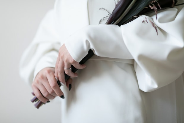 柔らかいドレス姿に、あえて寒色を合わせることでシックで個性的な花嫁さんに!