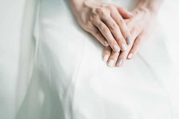 寒色の面積を少なくすることで、クールな印象になり過ぎずにウェディングドレスにも、カラードレスにもマッチするネイルに。