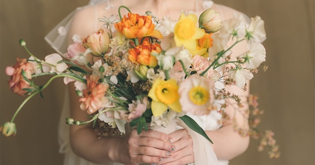 ビビッドなカラーのブーケには、グリーン&金箔を施したネイルを合わせて。
