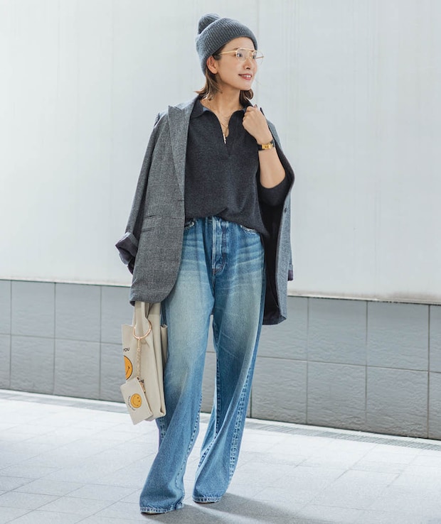 「グレンチェックのジャケットにポロニットを合わせ、デニムでラフに。カジュアルなスタイルこそジュエリーや眼鏡でツヤ感を演出するのが大切」