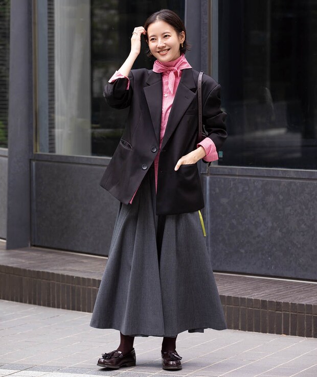 ムウ ト アールのジャケット、オブリオのシャツ、ランバン オン ブルーのスカート、フューチャークラシックスのバッグ、ランバン オン ブルー×ハルタのローファーは本人私物