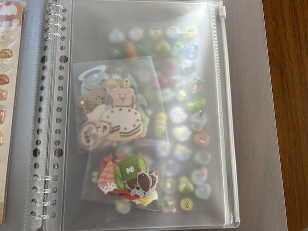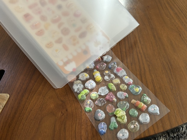 クリアポケットはつるつるした素材とゆったりサイズで出し入れがしやすい分、ぷっくり系のシールなど中ですき間ができるシールが滑り出てきやすいです。