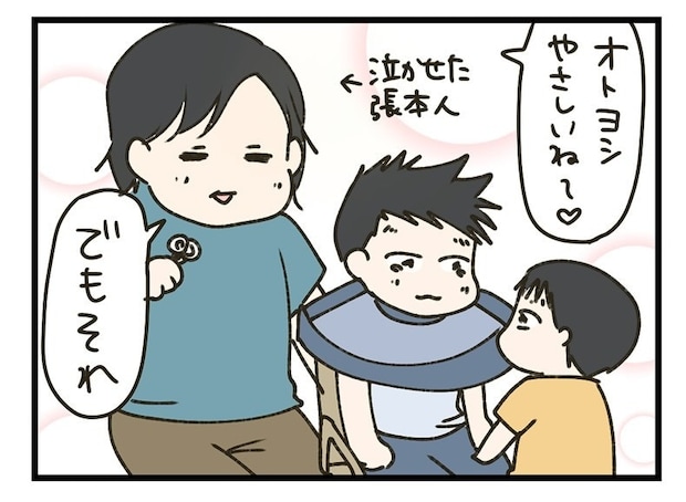 弟の優しさに感動…と思いきや、すでに使用済みのティッシュで兄の涙を拭いていたようです。一体何に使ったティッシュなのか気になるところですが、兄も笑ってくれて一件落着。兄弟のあたたかい絆を感じさせてくれるエピソードでした。
