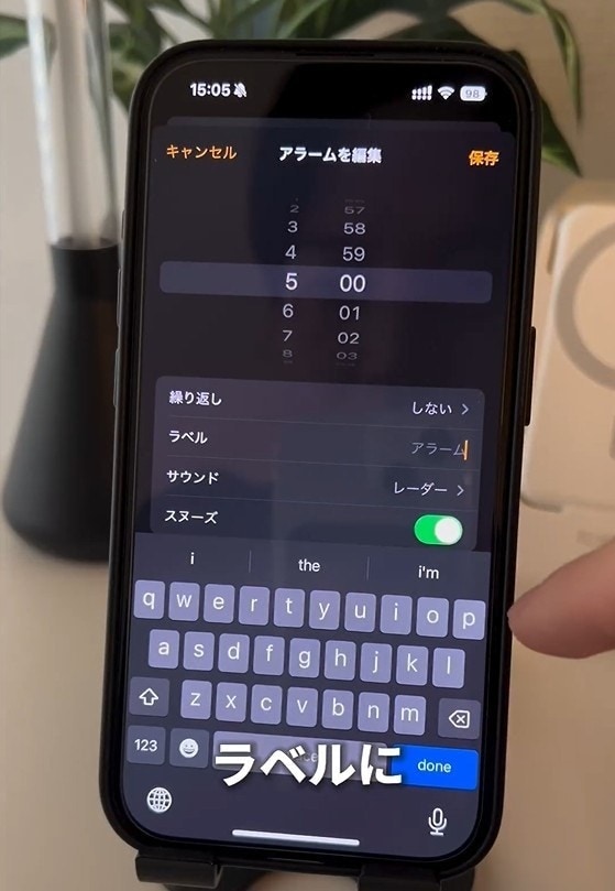 アラームの編集画面で、「ラベル」のところに文字を入力します。