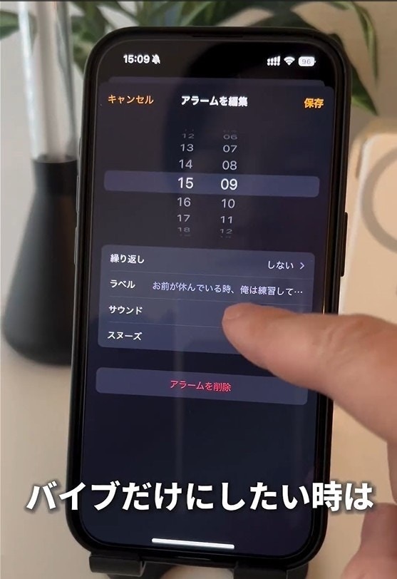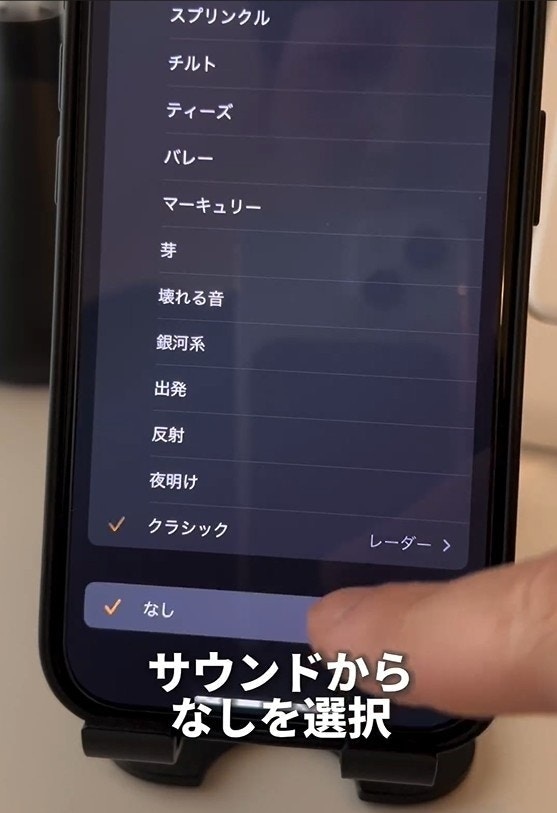 アラームの編集画面から、サウンドを選択して「なし」を選びます。