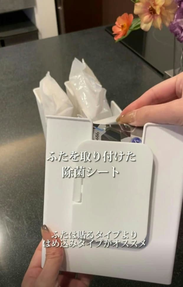 また、ふたを取り付けた除菌シートの収納にも。ちょうど蓋の部分が外に出る形になって、このまま使えるところも良いですね。