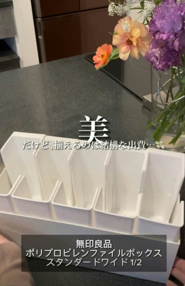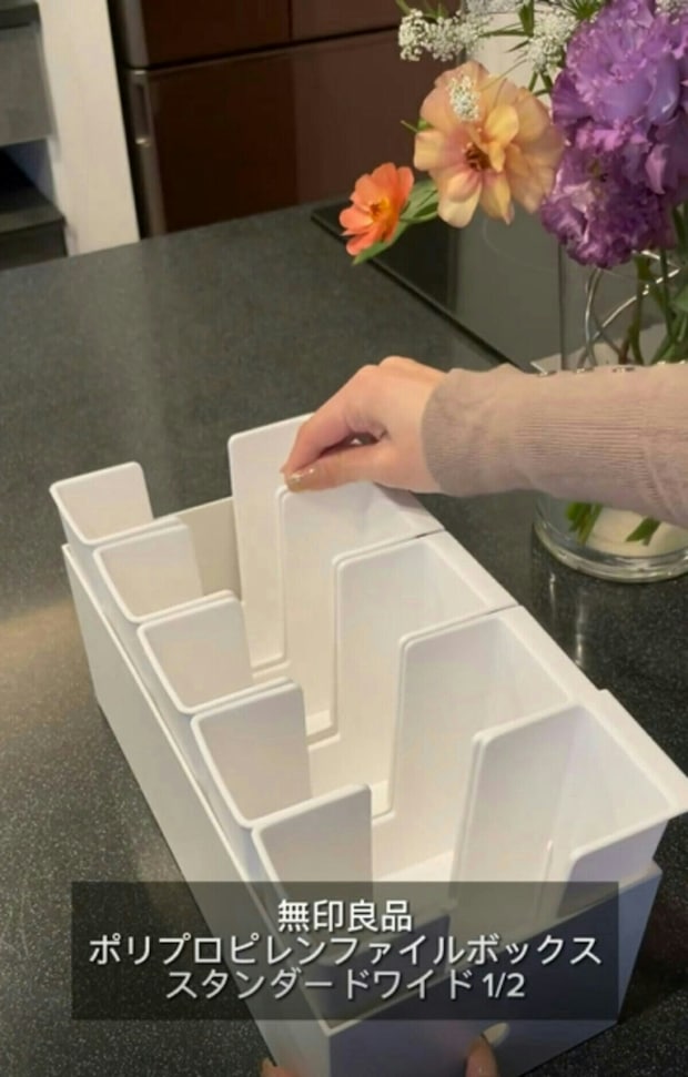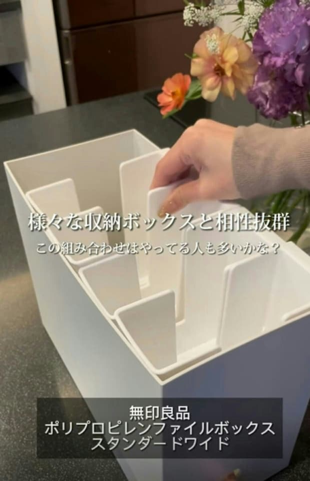 無印良品の商品「ポリプロピレンファイルボックススタンダードワイド」「ポリプロピレンファイルボックススタンダードワイド1/2」に、セリアの「パウチストッカー」がぴったりフィットするとのこと。