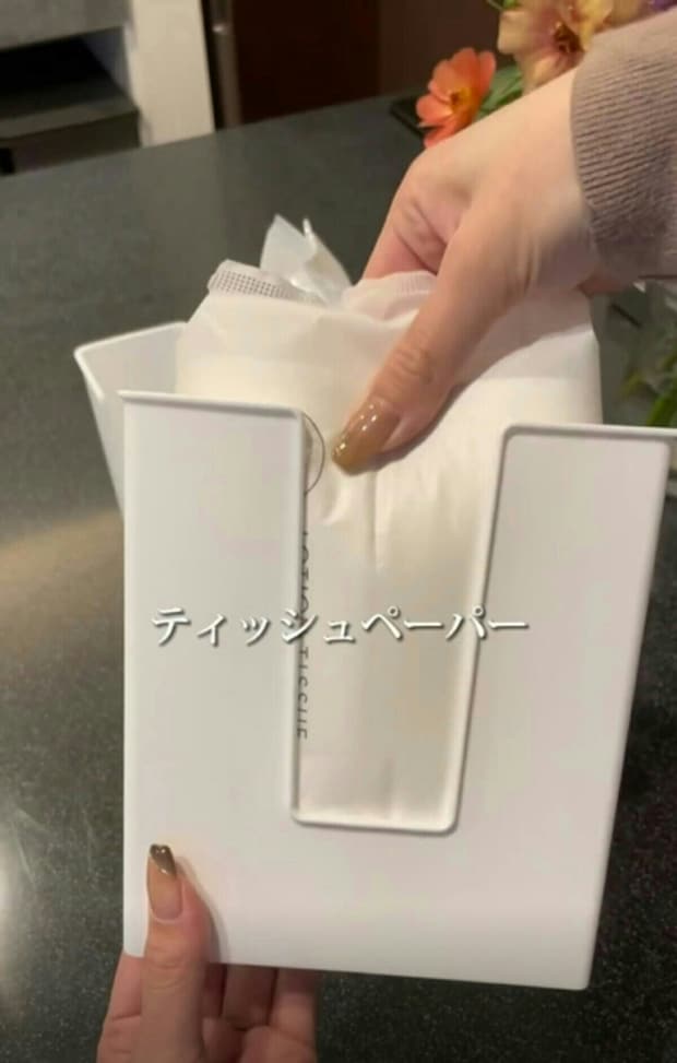 まずは、ティッシュペーパーの収納。ちょうどティッシュペーパーの取り出し口が、ストッカーの形にあって取り出せるようになっています。