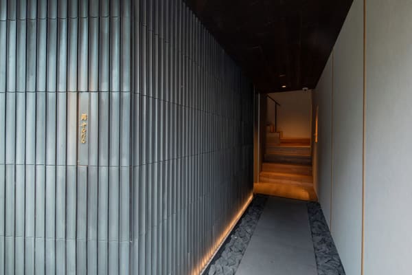 竹炭をモチーフにした廊下が、外の喧騒から離れ、食事に向き合う時間へと導く。