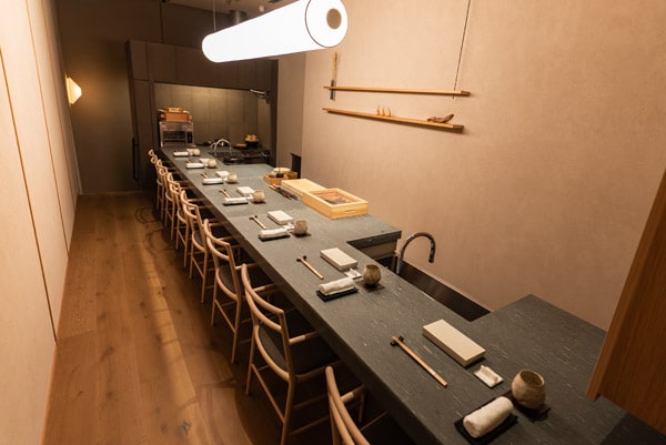 客席はカウンター席のみ。重厚な石のカウンターは、料理と食事の距離をなくしたいという店主の願いを表現した、付け台を用いない新しい形式。天井が高く開放的な空間となっている。