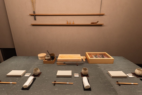 重厚な石のカウンター席のみの蔵前の静かな空間