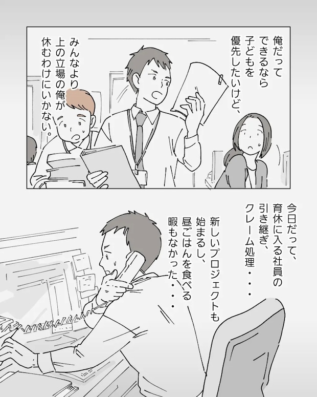 俺だって、できるなら子どもを優先したいです。ですがみんなより上の立場である以上、急に休むわけにはいきません。今日だって育休に入る社員の引き継ぎやクレーム処理、新しいプロジェクトも始まるし、昼休憩を取る時間すらありませんでした。