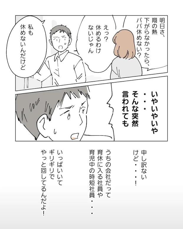 しかも急に「明日さ、翔の熱が下がらなかったらパパ休めない?」と言われて困ってしまいます。ちひろにはいつも仕事を早退してもらったり、休んでもらったりして申し訳ないと思っていますが、うちの会社だって育休に入る社員や時短社員がたくさんいてギリギリで回している状態です。とても自分が休みを取れるような状況ではありませんでした。
