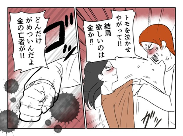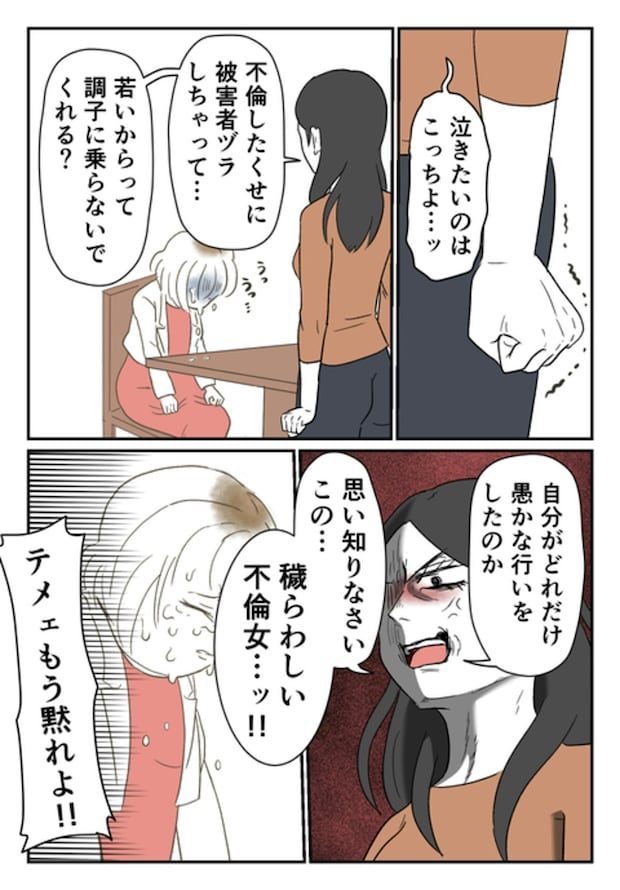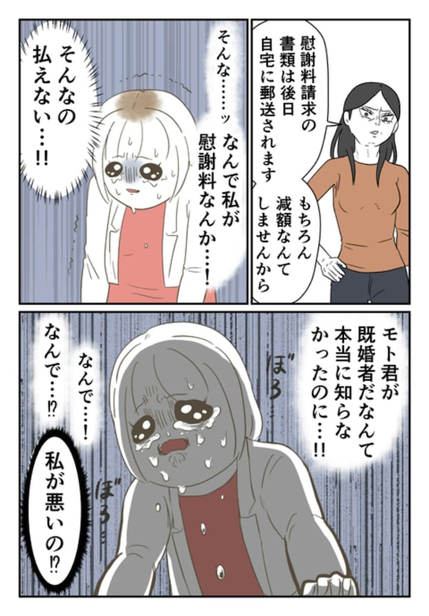 モトさんが「既婚者」であることを知らなかった、尾持さん。モトさんの妻から、不倫の慰謝料を請求されます。激高したモトさんは、妻を殴りつけ…。