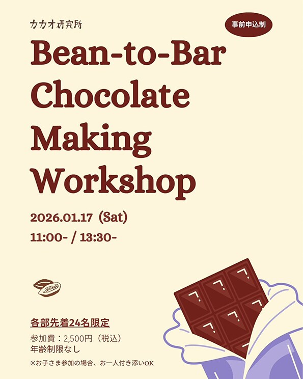 新しい年を迎え、今年もチョコレートの季節が近づいてきました。このワークショップでは、カカオ豆がどのような工程を経てチョコレートになるのかを学びながら、実際にチョコレート作りを体験することができます。