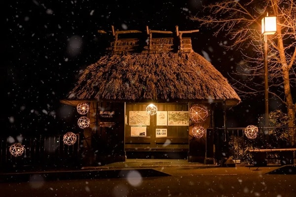 特にバス停エリアは、茅葺き屋根と毬灯籠の組み合わせが、日本の原風景のような懐かしさを感じさせる注目のスポットだ。足元を照らす幾何学模様の灯りに導かれながらのそぞろ歩きは、黒川ならではの醍醐味。期間中に雪が降れば、真っ白な雪と竹灯籠の温かなオレンジ色が織りなす、この世のものとは思えない神秘的なコントラストに出会える。
