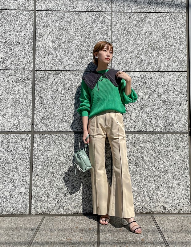 春の注目カラーのグリーンに、付け襟がポイント。「大きめの付け襟は、ブラックならかわいらし過ぎずに合わせやすい。この春のヘビロテ確実です」