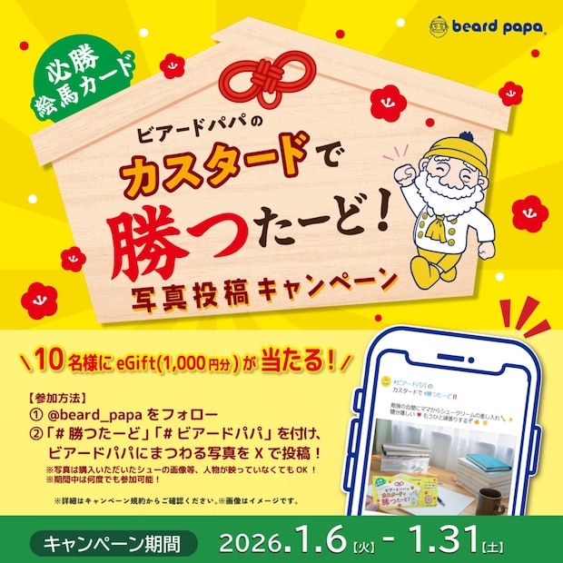 ビアードパパの公式Xアカウントをフォローした後、「#勝つたーど」「#ビアードパパ」の両ハッシュタグを付けてビアードパパにまつわる写真を投稿することで参加。写真付きで投稿した人の中から、抽選で計10人にビアードパパのeGiftチケット(1,000円分)をプレゼントする。