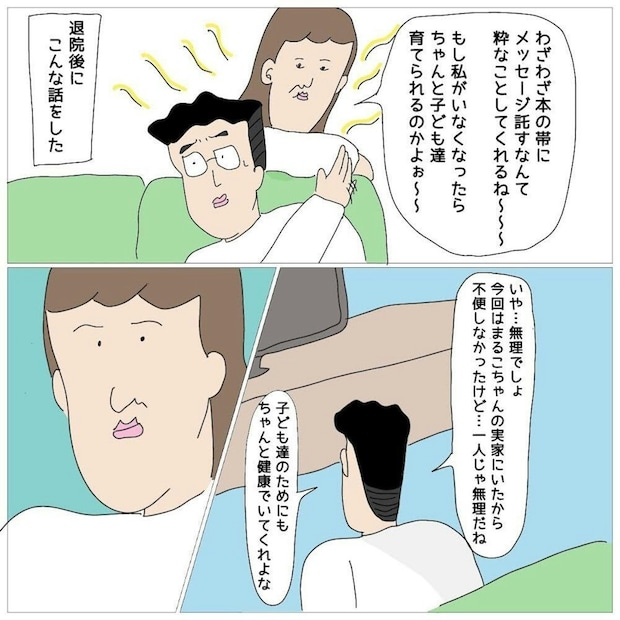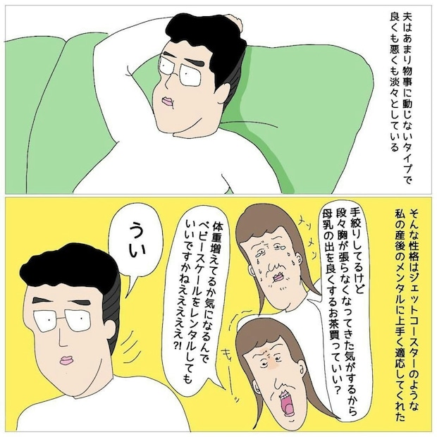 産後はホルモンのバランスが崩れて感情の起伏が激しくなるのに、今回は入院や授乳中断などのショックな出来事が続きまるこさんの心は荒れ果てていました。そんな中、夫は落ちついた対応で支えてくれました。