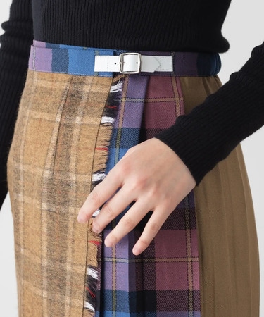 重厚感のある太めの本革レザーベルト2本がポイントのWベルトモデル「O’NEIL OF DUBLIN ウーステッドウール100% Wワイドベルト」にも注目。コーディネートを一気に引き締めてくれる、まさに主役級のスカートだ。