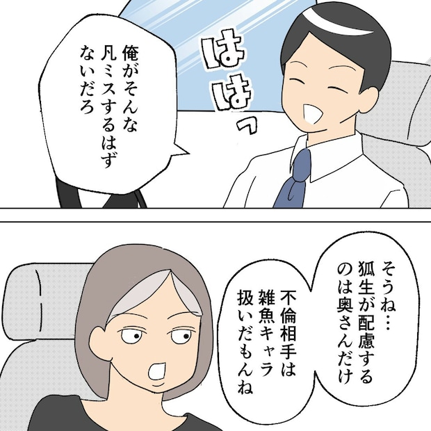 狐生は、多恵子に「バレていない」と自信たっぷりです。「奥さん以外は雑魚キャラ扱い」と言う浮気相手。そろそろ関係を終わりにしたいのでしょうか。