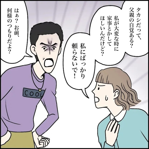 「タカシだって、父親の自覚ある?私が大変な時に家事とかしてほしいんだけど?私にばっかり頼らないで!」とさすがに腹が立って反論する私に、「はぁ?お前、何様のつもりだよ?」と怒り出すタカシ。