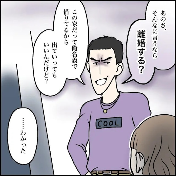 「あのさ、そんなに言うなら離婚する?この家だって俺名義で借りてるから、出ていってもいいんだけど?」いつもの決め台詞「離婚する?」と言われ、いつもなら急いで引き留めるのですが、「・・わかった」と答えました。