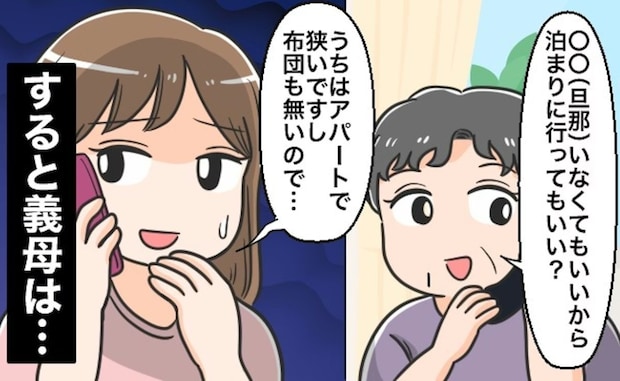 泊まりに来たら当然さまざまなおもてなしをしなければいけないでしょうし、夫が不在となれば全ての負担は投稿者さんにきます。その辺りの配慮があまりにもなさ過ぎて、もし筆者がこんなことを言われたら夫に愚痴を言って夫経由でやめるように話をしてもらうかなと思いました。