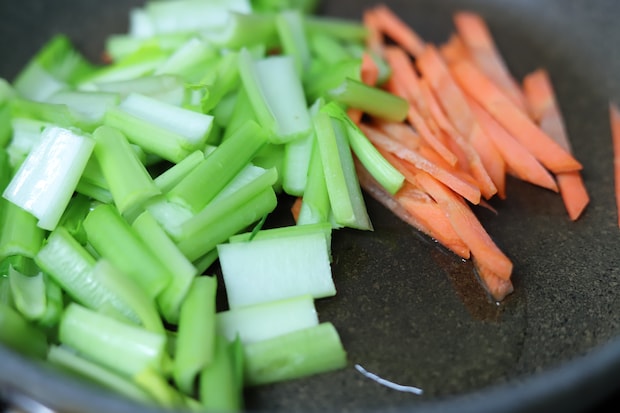 2. フライパンにサラダ油をひいて中火にかけ、小松菜の茎とにんじんを入れて加熱する。