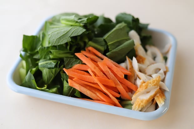 1. 小松菜は3cm幅に切り、ちくわは縦半分に切って斜めに8mm幅に切る。にんじんは2mm幅に切る。