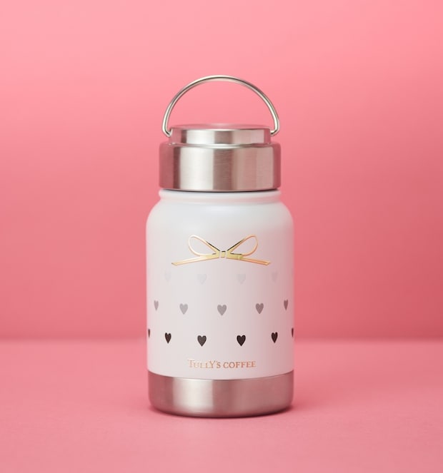 ハートモチーフで囲まれた寸胴型のステンレスボトル。ハンドル付きで持ち運びにも便利。