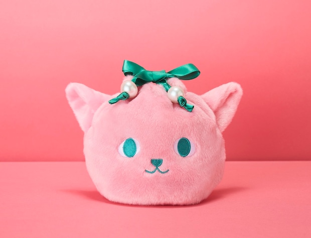 巾着の口を絞ると「ミャラウィ」の顔になる、ふわふわ生地のポーチ。内側とリボンは鮮やかなグリーンで、リボン先端のパールがアクセント。
