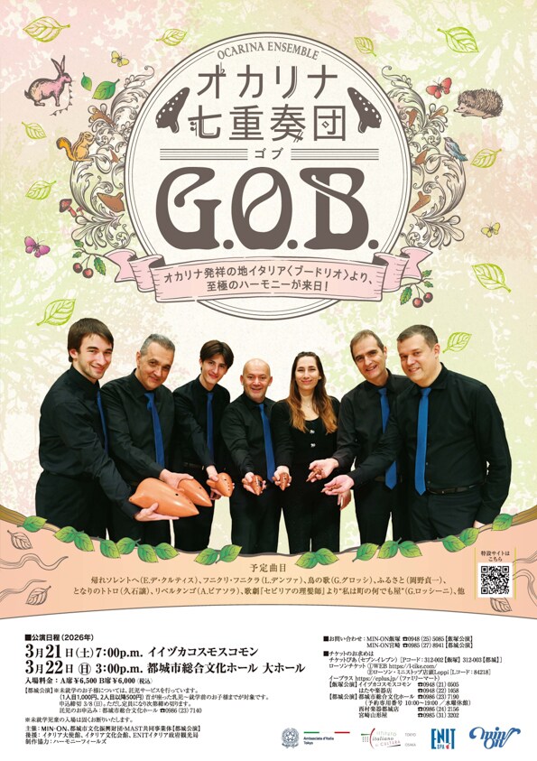 オカリナ発祥の地であるイタリアのブードリオで生まれた「オカリナ七重奏団 G.O.B.ゴブ」。160年近くの歴史と伝統を誇る合奏団は、2011年にイタリア文化省より文化遺産に認定されています。