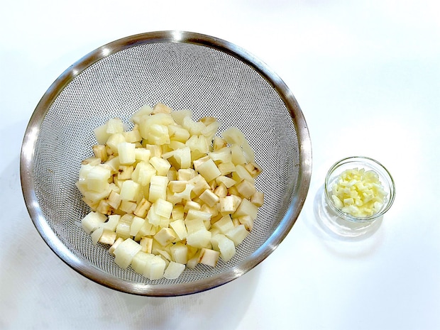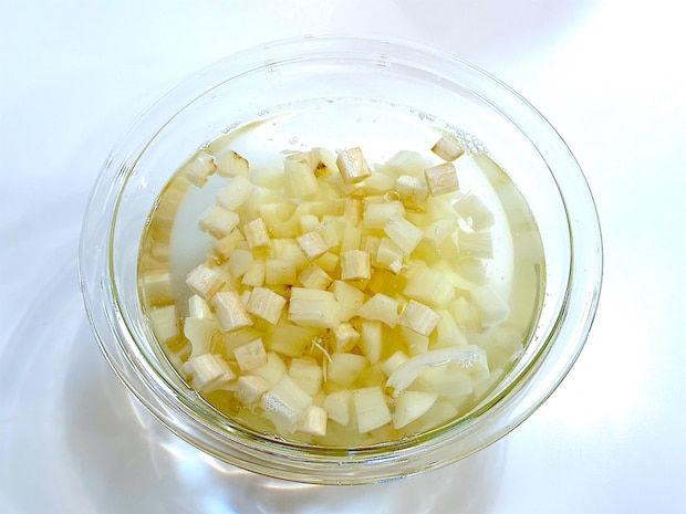 1. ごぼうとれんこんは皮を剥き、1cmくらいの角切りにして酢水にさらしたら水気を切る。にんにくはみじん切りにする。