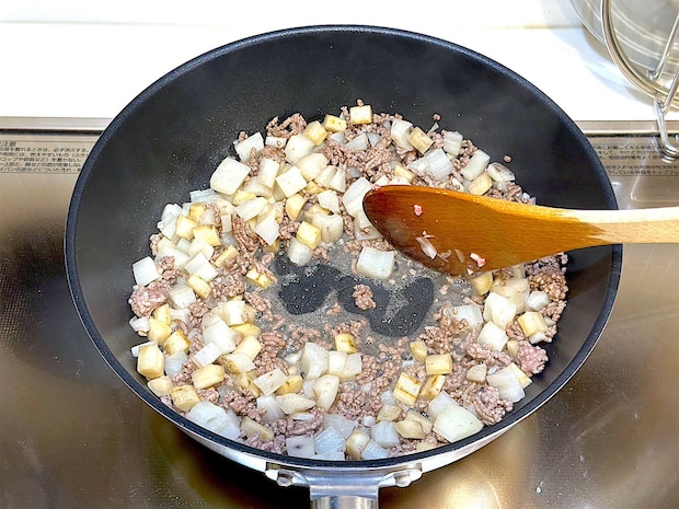 3. 深めのフライパンにサラダ油を熱し、1と合いびき肉を炒める。