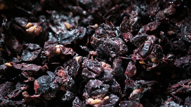 バッグを染めるのに使用するのは、北海道のワイナリーでワインづくりを終えた葡萄の果皮。果皮をワイナリーから受け取り、皮と茎を手作業で選別・乾燥させたのち、染料を作る。染色は職人が10枚ずつ丁寧に手作業で行い、自然素材ならではの奥行きある色合いに仕上げている。