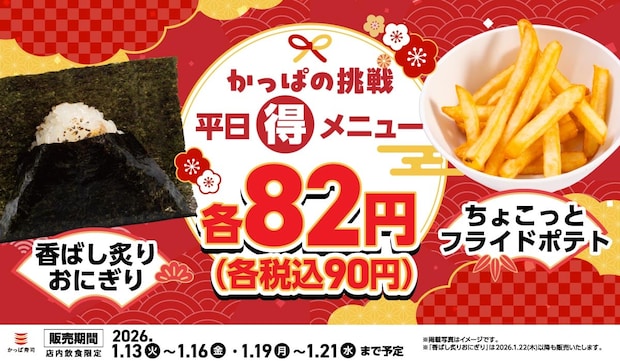 回転寿司(ずし)チェーン「かっぱ寿司」が、「かっぱの挑戦 平日(得)メニュー」と題し、「香ばし炙(あぶ)りおにぎり」と「ちょこっとフライドポテト」を1月13日から平日限定で90円(以下、税込み)で販売します。